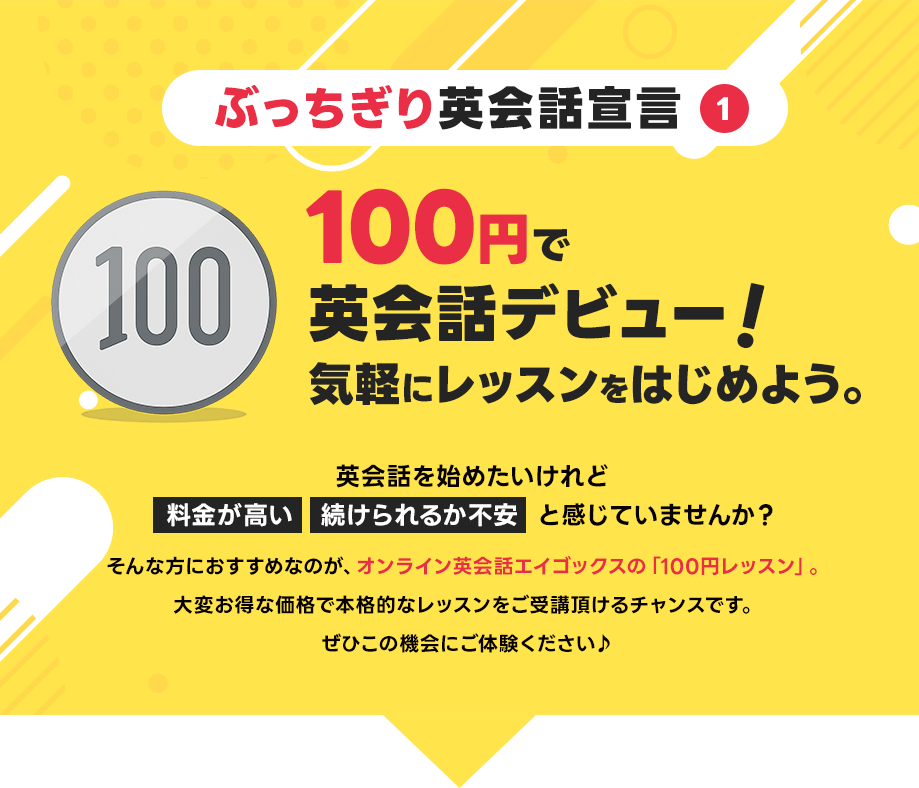 - ネイティブ講師・フィリピン人講師の本格レッスン(25分)が100円で受講可能。