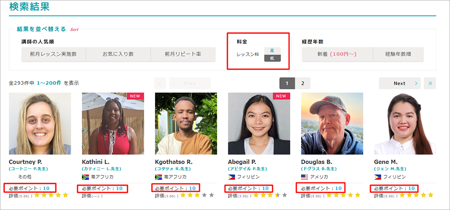 - 2. レッスン料が低い順番で並び替え、「必要ポイント:10」の講師を選択。